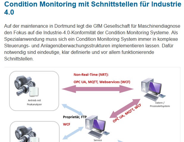 Zur Integration in Steuerungssysteme stehen verschiedene Schnittstellen zur Verfügung. So können Schädigungszustände in Echtzeit beispielsweise per Profibus oder Profinet übermittelt werden und dem Bedienpersonal einer Produktionsanlage direkt visualisiert werden. Der Instandhalter wird wesentlich ausführlichere Informationen bis hin zu den eigentlichen Messdaten dagegen eher über OPC UA, MQTT oder WCF erhalten. Über diesen Weg ist perspektivisch auch die Parametrierung des Condition Monitoring System denkbar.