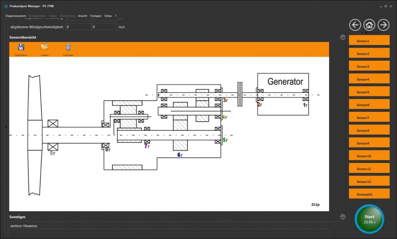 The frequencies of these natural vibrations are determinable, but usually different from machine to machine. In practice, the best diagnosis results are achieved, through broadband measurements. This results in the relatively high sampling frequency of 50 kHz of the PeakStore5.