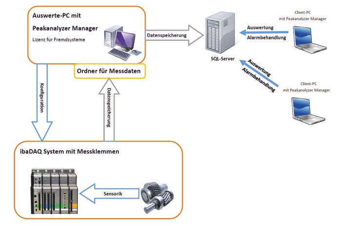 Ist auf dem Peakanalyzer Manager eine Lizenz für die Einbindung von Fremdsystemen vorhanden, kann ein neuer Gerätetyp Fremdsystem hinzugefügt werden. Die Infrastruktur wird am Beispiel des Messsystems von der iba AG im Bild veranschaulicht. Der eigentliche Messablauf und die Analyseaufgaben des Messsystems werden nicht gestört. Es wird lediglich ein weiteres Datenaufzeichnungsmodul hinzugefügt, welches dafür sorgt, dass ausgewählte Messkanäle für die Schwingungsdiagnose zusätzlich aufgezeichnet werden sollen. Die eigentliche Konfiguration und Analyse der Messdaten für die Schwingungsdiagnose findet auf einem separaten PC mit angeschlossener SQL-Datenbank statt. Die weitere Auswertung und Alarmbehandlung kann, wie gewohnt beim Peakanalyzer Manager, über einen separaten Client-PC oder direkte auf dem Auswerte-PC durchgeführt werden. Es ist auch möglich von einem Auswerte-PC aus mehrere verschiedene Fremdsysteme einzubinden.
